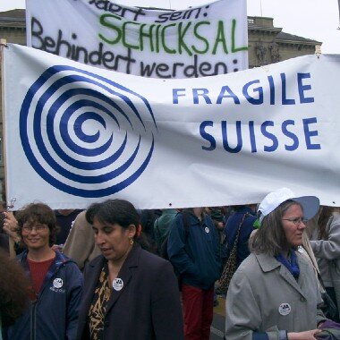 Mitarbeitende und Mitglieder von FRAGILE Suisse demonstrierten am 26. April 2003 gemeinsam mit 4'500 anderen Personen auf dem Bundesplatz in Bern. Gemeinsam forderten wir ein Ja zur Behinderteninitiative und somit gleiche Rechte für Menschen mit Behinderung.